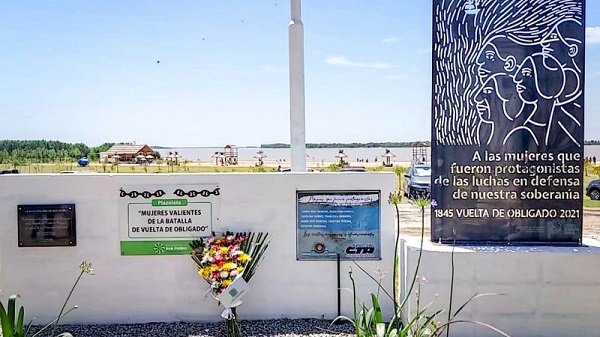 Una placa de casi dos metros fue instalada en el parque histórico “Vuelta de Obligado” para homenajear a las mujeres que participaron en la batalla del 20 de noviembre de 1845, en la que tropas de línea y fuerzas auxiliares de la Confederación argentina se enfrentaron con la flota anglofrancesa sobre un recodo del Paraná y en las barrancas contiguas al río, 30 kilómetros al norte de San Pedro. “A las mujeres que fueron protagonistas de las luchas en defensa de nuestra soberanía”, dice la inscripción en la lámina de…