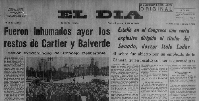 Rubén Alberto “El Chino” Cartier, intendente en funciones de La Plata, fue asesinado por un grupo parapolicial, en Sarandí, partido de Avellaneda, cuando se dirigía a Capital Federal a una reunión con gobernadores, funcionarios y referentes del peronismo.