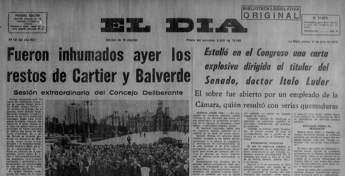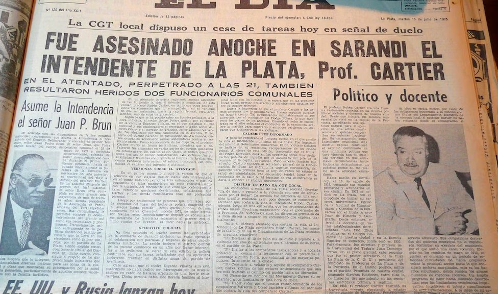 Rubén Alberto “El Chino” Cartier, intendente en funciones de La Plata, fue asesinado por un grupo parapolicial, en Sarandí, partido de Avellaneda, cuando se dirigía a Capital Federal a una reunión con gobernadores, funcionarios y referentes del peronismo.