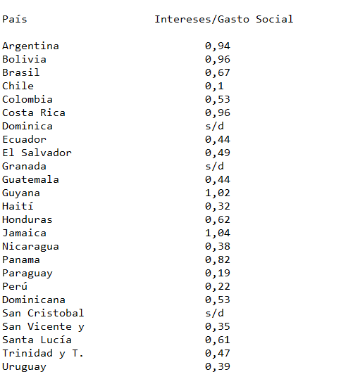 Si nos concentramos en la comparación de los servicios de la deuda (eufemismo como si la deuda nos prestara algún servicio) (4) con el gasto social presupuestado (educación + salud + protección social) de cada país, nos dará una muestra de la centralidad y orientación de cada economía.