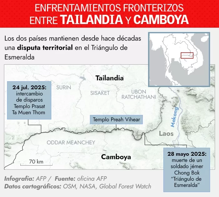 La chispa inmediata del enfrentamiento fue en apariencia local: un soldado camboyano murió a fines de mayo mientras cavaba trincheras cerca de la frontera, en una zona disputada. El incidente encendió rápidamente una espiral de tensiones: minas terrestres colocadas en el área hirieron a varios soldados tailandeses, lo que generó un fuerte debate en el Parlamento de Bangkok.
