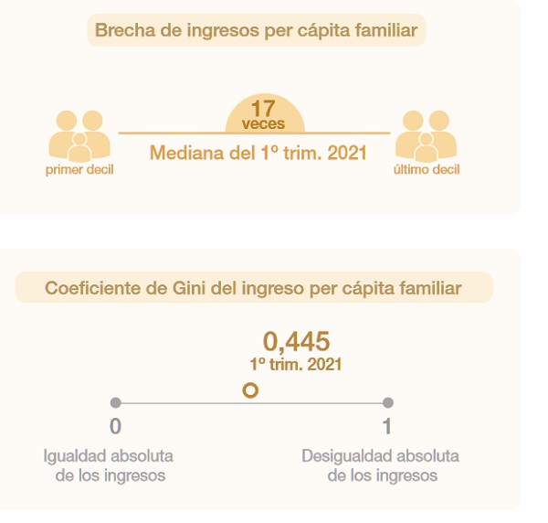 El coeficiente de Gini del ingreso per cápita familiar de las personas fue de 0,434 para el segundo trimestre de 2021 mientras que, en el mismo trimestre de 2020 fue de 0,451, lo que muestra una disminución de la desigualdad. La brecha calculada entre la mediana del decil 10 y el decil 1 de ingreso per cápita familiar de la población fue de 16. En la comparación interanual, la brecha de la mediana se redujo tres puntos con respecto al segundo trimestre de 2020. Respecto al último trimestre sin aguinaldo (cuarto trimestre de 2020), bajó dos puntos.