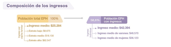 Un 58,6% de la población total percibió algún tipo de ingreso (laboral o no laboral), cuyo promedio fue de $43.907. Analizado según la escala de ingreso individual, el ingreso promedio del estrato bajo (deciles del 1 al 4) equivale a $15.357; el del estrato medio (deciles del 5 al 8), a $40.994; y el del estrato alto (deciles 9 y 10), a $106.880. Los perceptores varones tuvieron un ingreso promedio de $51.916, mientras que el de las mujeres fue de $36.025. Es decir, las mujeres tienen ingreso 30% por debajo de los varones.