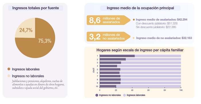 En el caso de los hogares, los ingresos laborales representaron el 76,5% de los ingresos totales, mientras que los ingresos no laborales alcanzaron el 23,5% restante. El peso de los ingresos no laborales fue mayor para los deciles de ingreso total familiar más bajos, siendo 66% en el primero y 11,7% en el décimo.