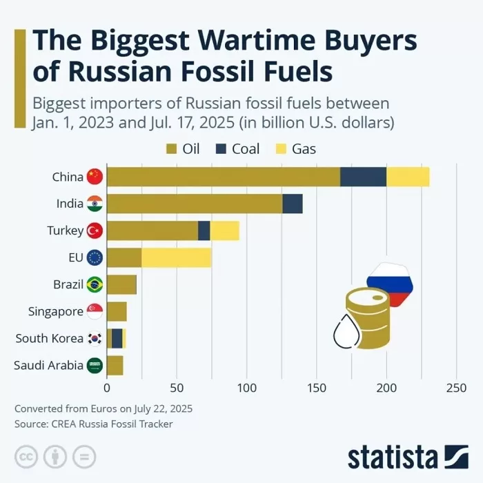 En paralelo al conflicto militar, la guerra económica y energética adquirió una nueva dimensión. Donald Trump incluyó en su ultimátum a Rusia la amenaza de sanciones secundarias “más severas que las impuestas a Irán” contra todos los países o empresas que compren petróleo ruso por encima del precio tope de 60 dólares fijado por el G7.
