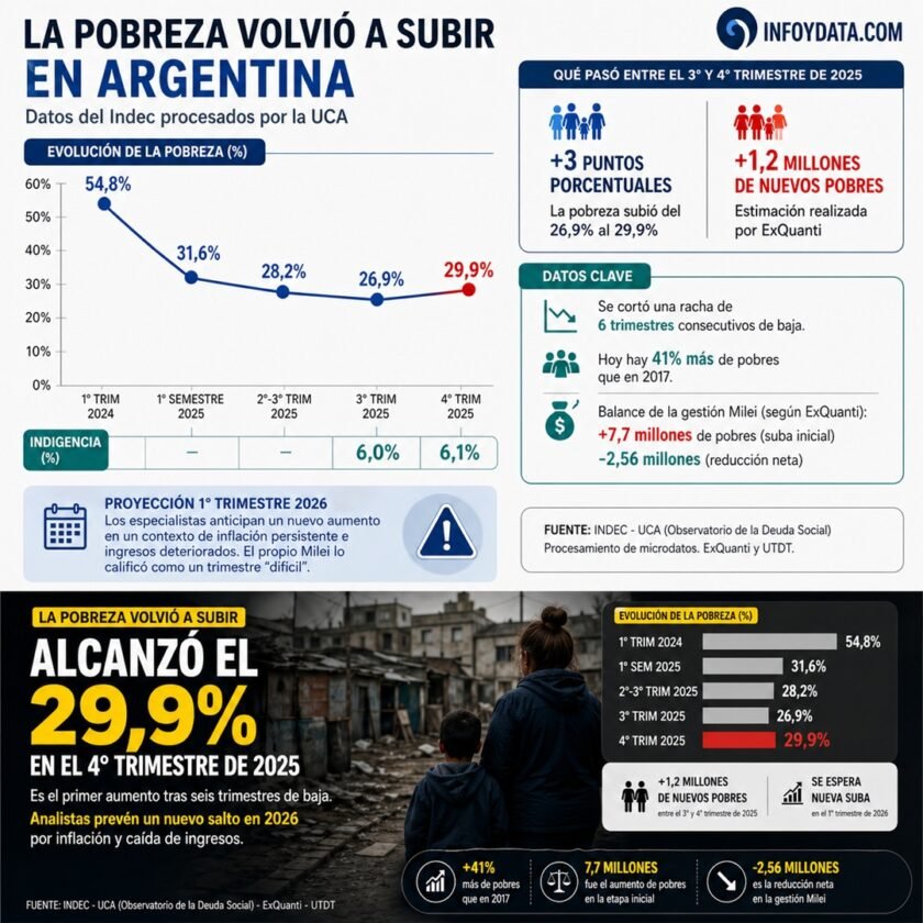 Según datos del Indec procesados por la Universidad Católica Argentina (UCA), el indicador trepó del 26,9% al 29,9% entre el tercer y el cuarto trimestre de 2025, lo que representa un aumento de tres puntos porcentuales y alrededor de 1,2 millones de nuevos pobres, de acuerdo con estimaciones de la consultora Experiencia Quantitativa (ExQuanti).