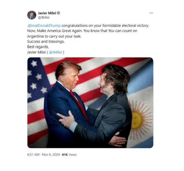 “Ahora, a hacer América grande de nuevo (Make America Great Again). Sabés que podés contar con la Argentina para llevar tu tarea”, señaló.